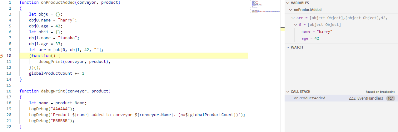 You can also evaluate code in the current context. In the “Debug Console” write the code to evaluate. For example, to check the value of an object named e’s name property, you can simply write e.name and hit enter (while the call stack that contains e is the active call frame). You can also set the value of name by writing something like e.name = "NewName" and hitting enter.