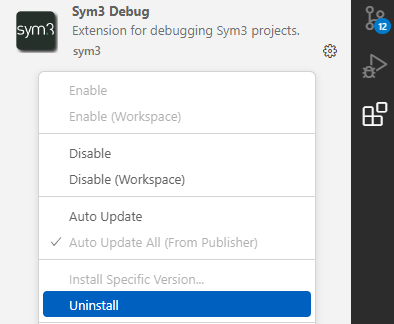 To update or reinstall the extension, simply follow those steps again. To uninstall the extension, click the gear next to the “Sym3 Debug” extension and click “Uninstall”.