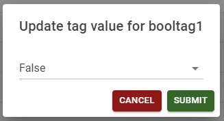 Click the ‘UPLOAD’ button on a boolean tag row to open the value update dialog. The window has a dropdown list with True/False options. Choose a value and click ‘Submit’ to send the value to the server.