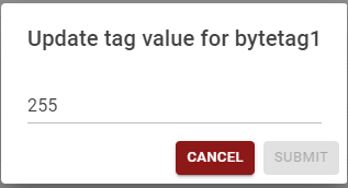 Click the ‘UPLOAD’ button on a numeric tag row to open the value update dialog. The window has a numeric input component. The ‘Submit’ button will be enabled if the input value is valid and the value is different from the current value.