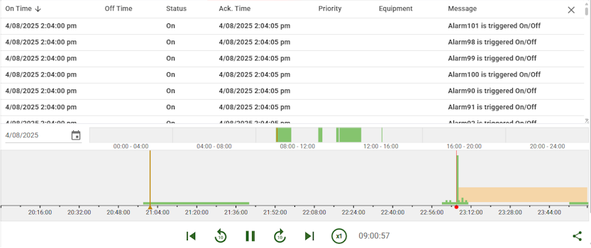 The Timeline Control displays historical alarms as color-coded sections. Each section shows an alarm or group of alarms, positioned based on their start and end times.